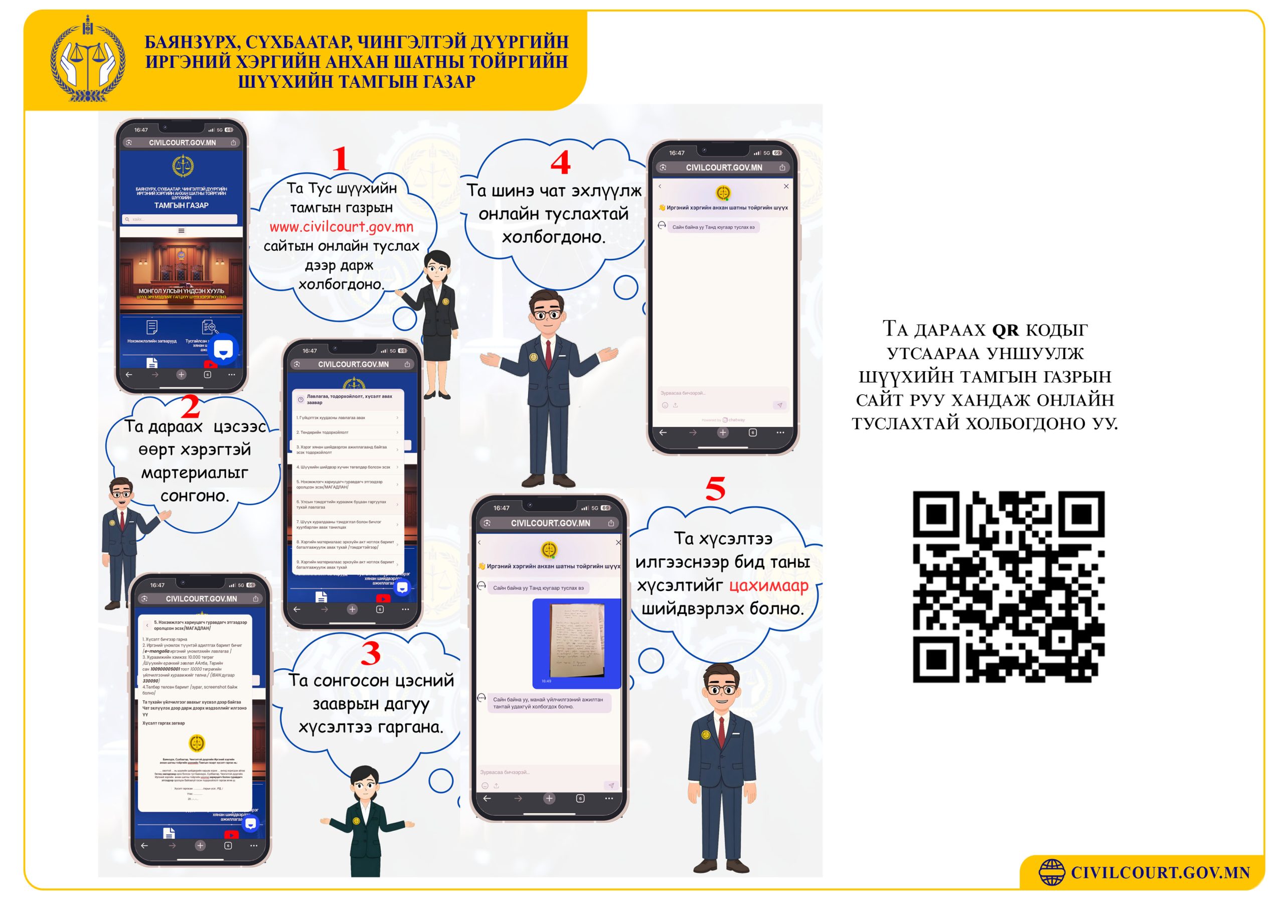 Шүүхийн үйлчилгээг иргэд цахимаар авч эхэллээ. 2025-09-29 No Comments Шүүхийн үйлчилгээг иргэд цахимаар авч эхэллээ. Та дараах үйлчилгээг өглөөний 8:30-17:30 минутын хооронд www.civilcourt.gov.mn цахим хуудасны онлайн туслах үйлчилгээтэй холбогдож
